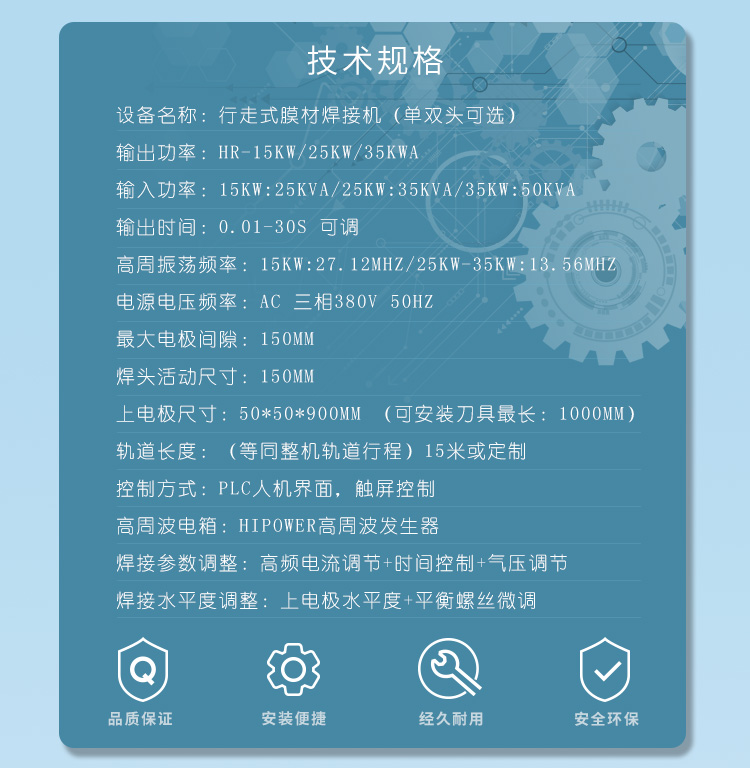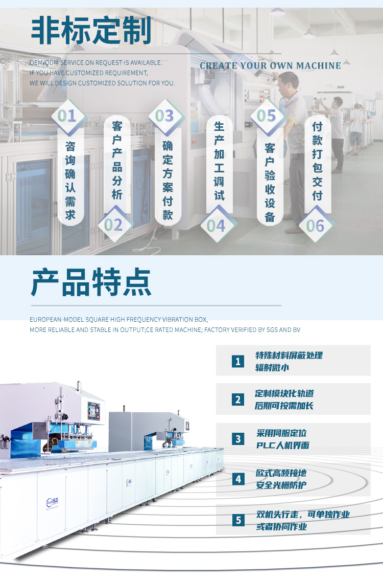 自動行走式高周波帆布熔接機的用途: ※通過高周波的原理,用來做高周波PVC沼氣池熔接、PVC蓄水池熔接、PVC兒童游泳池熔接,也可以用來做高周波汽車篷布帆 布接駁、高周波帳篷布熔接、高周波電影幕布熔接、高周波膜結(jié)構(gòu)拼接、戶外膜結(jié)構(gòu)焊接、膜結(jié)構(gòu)熔接、高頻戶外遮陽布熔接、 高頻廣告噴繪布焊接、高頻PVC布熔接或含有PVC成分的任何材質(zhì)的軟性塑膠塑料的高周波熔接或拼接。通過高周波的作用后,被 高頻熔接的材料,表面光滑平整且美觀牢固。 自動行走式高周波帆布熔接機的特點: ※自動行走式高周波帆布熔接機,采用智能化PLC人機界面操作系統(tǒng),步進或伺服馬達驅(qū)動。自動行走,位置精準(zhǔn),無需搬動材料 和機器。一條接縫一次性完成,接縫整齊,無皺紋,無刀印。每分鐘可達5-10m的焊接速度??筛鶕?jù)用戶需要,選擇不同高周波功率 大小的機器,每次焊接材料的長度及寬度,均可以通過改變高周波模具的尺寸長短寬度,實現(xiàn)膜結(jié)構(gòu)或帆布的自動熔接需要。機器的 內(nèi)側(cè)設(shè)有相應(yīng)跨度的放料槽,放料槽的跨度和深度可根據(jù)焊接的產(chǎn)品大小選擇。以滿足不同大小面積的帆布熔接及接駁。膜結(jié)構(gòu)帆布熔 接機的鐳射掃描定位系統(tǒng)為可選配置,方便每次焊接時精準(zhǔn)定位。 ※自動行走式高周波帆布熔接機的高頻振蕩系統(tǒng)為歐式方形同軸結(jié)構(gòu),高周波輸出的力量穩(wěn)定強大。高周波熔接機內(nèi)設(shè)有高周波 NL5557火花保護系統(tǒng),可防止損壞高頻熔接模具。高周波膜結(jié)構(gòu)熔接機的焊接時間,可根據(jù)材質(zhì)厚薄不同自由設(shè)定,高周波的功率輸 出大小精密可調(diào)。 ※每次熔接牢固穩(wěn)定,材料厚薄均可滿足。機器料糟深寬,方便大面積連續(xù)接駁。機器可連續(xù)壓線接熔,接熔長度可以自由定制。 歐洲制式方形高頻震蕩箱,出力更大,更加穩(wěn)定。機器為C型結(jié)構(gòu),機身至焊頭跨度長達750mm??蛇B續(xù)壓線接熔,也可以選擇同 時雙線熔接。 ※自動行走式高周波帆布熔接機又稱為高周波汽車篷布帆布接駁機、高周波帳篷布熔接機、高周波電影幕布熔接機、高周波膜結(jié)構(gòu) 拼接機、戶外膜結(jié)構(gòu)高周波焊接機、膜結(jié)構(gòu)高周波熔接機、高頻戶外遮陽布熔接機、高頻廣告噴繪布焊接機、高頻PVC布熔接機、高 周波塑膠塑料熔接機、高周波熔接拼接機、高周波汽車篷布焊接機、高周波戶外帳篷制作機、遮陽膜結(jié)構(gòu)高周波焊接機、廣告噴繪布 高周波接駁機、高周波熱汽球制造機、電影幕布高周波縫合機高周波帆布熔接機,高周波膜結(jié)構(gòu)熔接機,高周波帆布機,汽車帆布熔接機。 高周波膜結(jié)構(gòu)帆布熔接機的技術(shù)規(guī)格: 機 型: HR-8KWA HR-10KWA HR-12KWA HR-15KWA HR-25KWA 高 周 功 率: 8000W 10000W 12000W 15000W 25000W電 源 電 壓: 380V 50/60HZ 高 周 頻 率: 27.12MHZ 13.56 MHZ 輸 入 功 率: 15KVA 18KVA 20KVA 25KVA 35KVA 整 流 器: 矽二極體 振 蕩 管: 7T69RB E3069 E3130 8T85RB 8T25RA 最 大 壓 力: 500kg 600kg 800kg 1000kg 1500kg 電 極 間 隔: 150 mm 活 動 行 程: 150 mm 上模夾 尺寸:50*50*800mm 50*50*800mm 50*50*900mm 60*60*900mm 50*50*1000mm 熔 接 時 間: 0---10s <機器相關(guān)所有尺寸,均可根據(jù)用戶要求定制。因改良需要,規(guī)格變動不另通知> |
