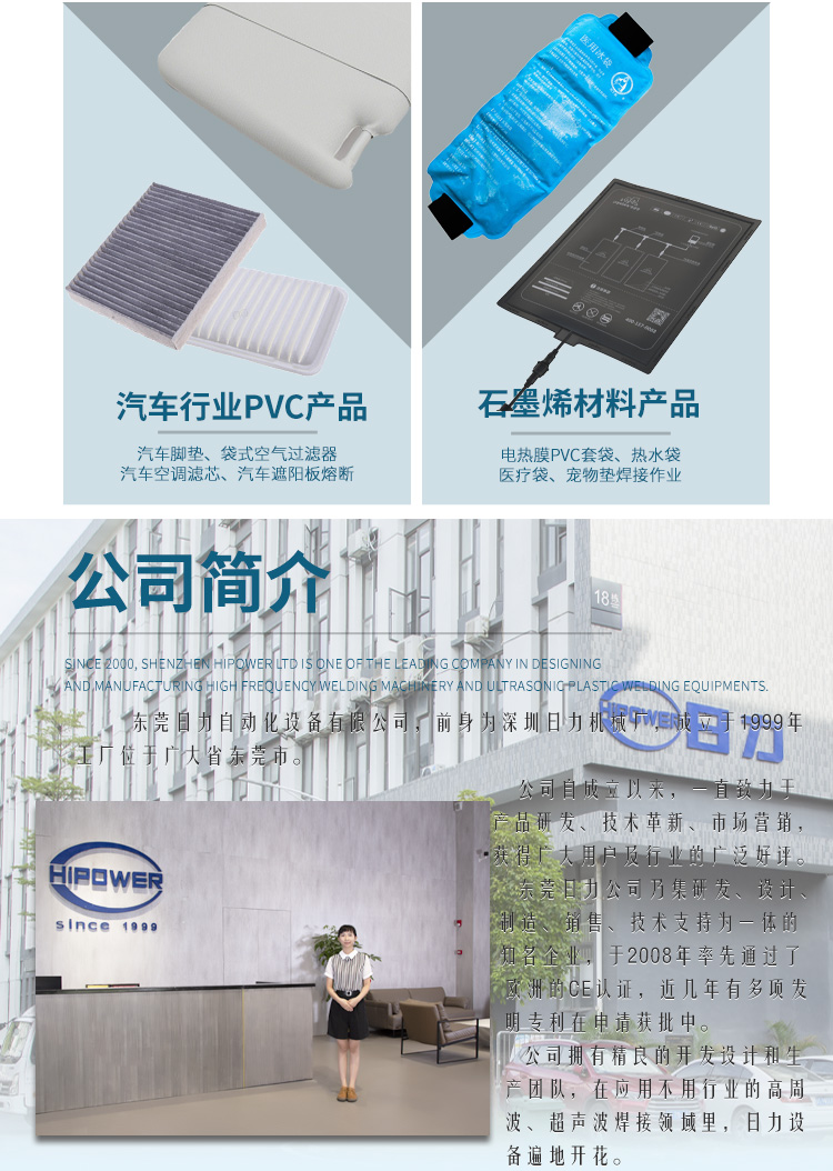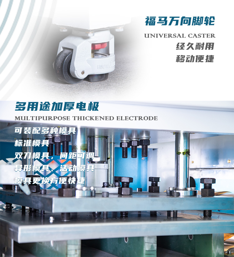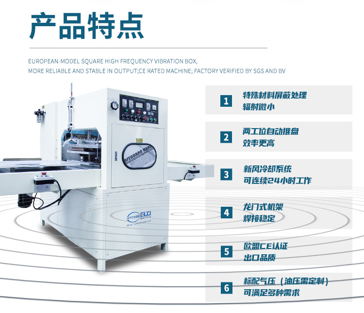 主要用于需要高周波熔接同時(shí)又必須同步裁斷的產(chǎn)品加工,高周波機(jī)的工作原理是利用高周波先熔接再通過機(jī)器配有的壓力裝置同時(shí)切斷。也適用于APET、PETG、GAG環(huán)保材質(zhì)的雙面吸塑泡殼的封口包裝、吸塑紙卡包裝、牙刷封口包裝,以及EVA布類皮革、真皮、OPP、PU、表帶、吊帶、熱水袋、保暖袋等需要熔接又要同步熔斷的產(chǎn)品。