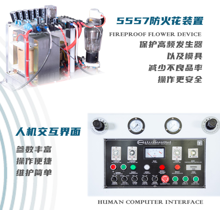 ★滑臺(tái)式周波熔斷機(jī)采用臺(tái)灣馬達(dá)驅(qū)動(dòng),工位定位準(zhǔn)。熔斷機(jī)配有NL-5557高周波火花保護(hù)系統(tǒng),靈敏度高,防止燒損高周波模具。并設(shè)有高周波頻率穩(wěn)定器及高周波屏蔽裝置,將高頻干擾降低,避免電波干擾。同時(shí)可以避免由不當(dāng)操作所引起的頻率漂移,使電極和物料損壞減低同時(shí)警告燈亦發(fā)亮 ★高頻機(jī)振蕩頻率符合國(guó)際工業(yè)波段標(biāo)準(zhǔn),由高Q值真空電子管自激振蕩器產(chǎn)生高頻電磁場(chǎng),使加工塑膠在上下電極間的高頻電場(chǎng)內(nèi),使其分子產(chǎn)生劇烈運(yùn)動(dòng)摩擦,在模具的壓力下得到其熔接效果。高周波熔斷機(jī)采用H型龍門結(jié)構(gòu),左右雙向自動(dòng)滑臺(tái),往返連續(xù)推送模具,運(yùn)行高效。
