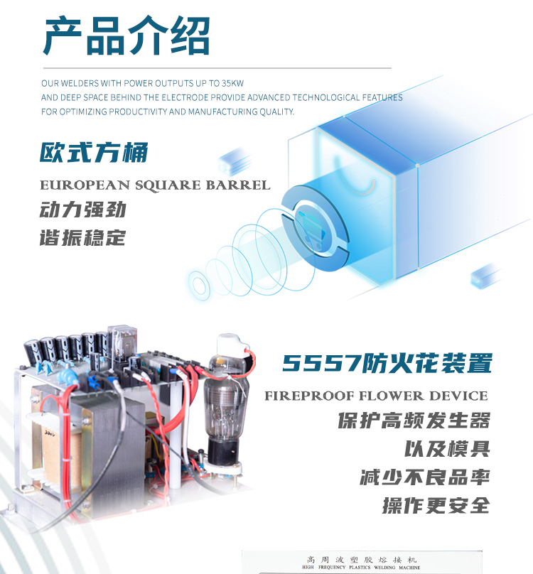 ※高頻功率輸出,可根據(jù)工件大小自由設(shè)定輸出高周波功率,以滿足不同尺寸大小的產(chǎn)品埋植熔接。 高頻埋植機(jī)可根據(jù)客戶