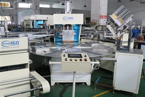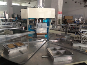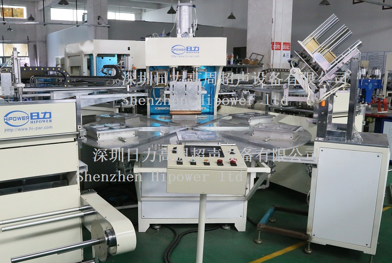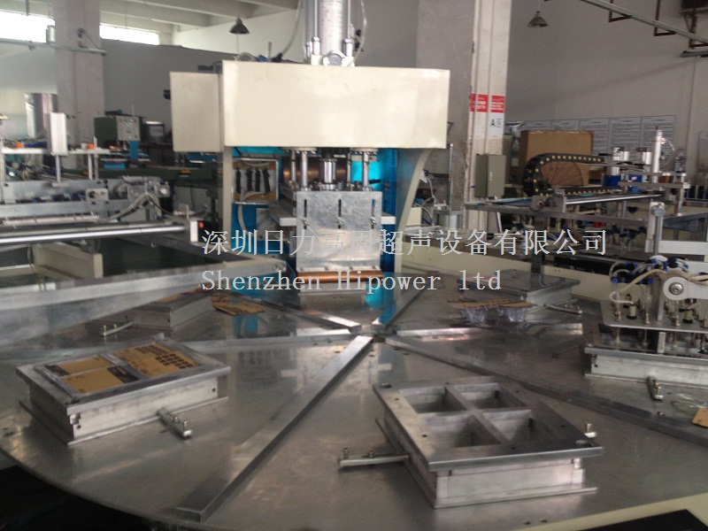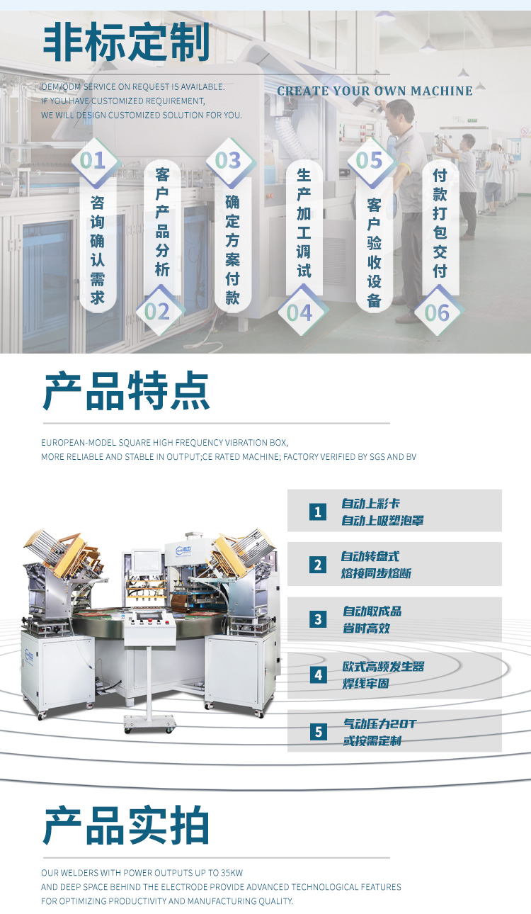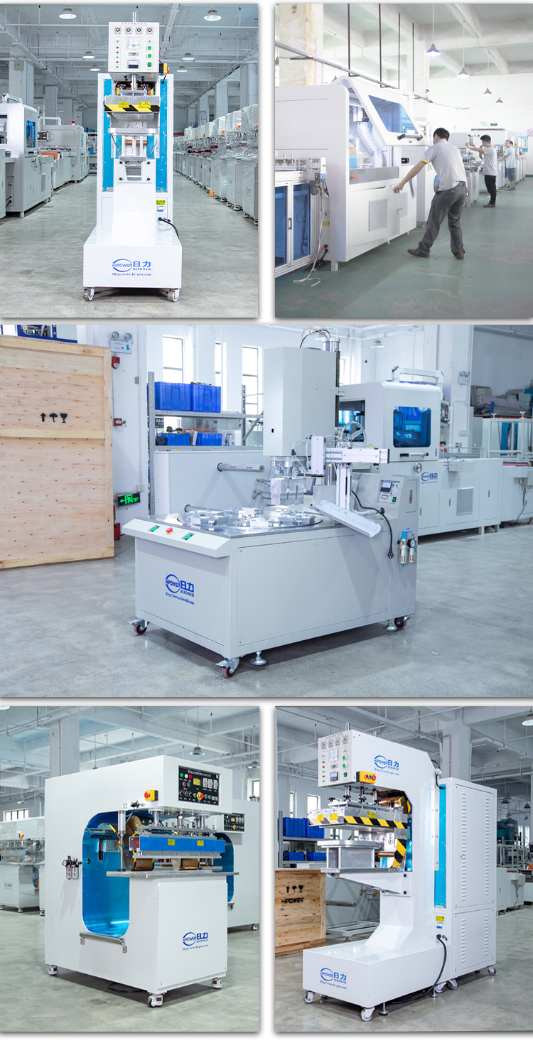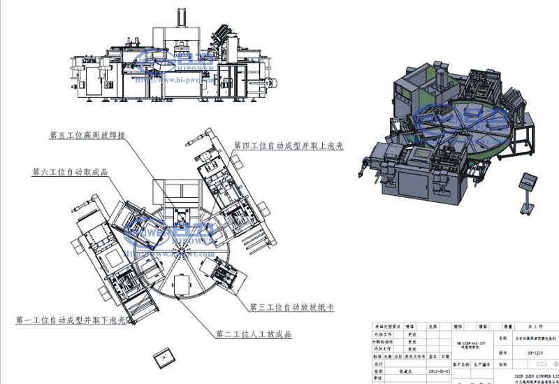 本設(shè)備是由深圳日力公司自主開發(fā)研制的一套自動(dòng)高周波吸塑包裝的熔接作業(yè)設(shè)備,本設(shè)備工序流程如下: 第1個(gè)工位底蓋吸塑成型裁切并自動(dòng)放入轉(zhuǎn)盤模具內(nèi)、 第2個(gè)工位由人工(或機(jī)械手)放被包裝物, 第3個(gè)工位由機(jī)械手自動(dòng)放入紙卡到模具, 第4個(gè)工位上泡殼吸塑自動(dòng)吸塑成型裁切并自動(dòng)放入模具, 第5個(gè)工位高周波進(jìn)行自動(dòng)熔接裁切處理,
