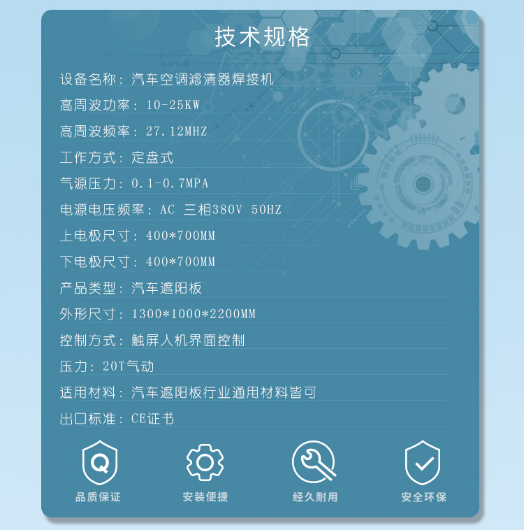 時(shí)切斷,基本上是同時(shí)完成。適用于大面積的高周波熔接裁斷,坐墊成型,大型腳墊成型,APET,PETG,GAG等環(huán)保材料的高周波柔軟線