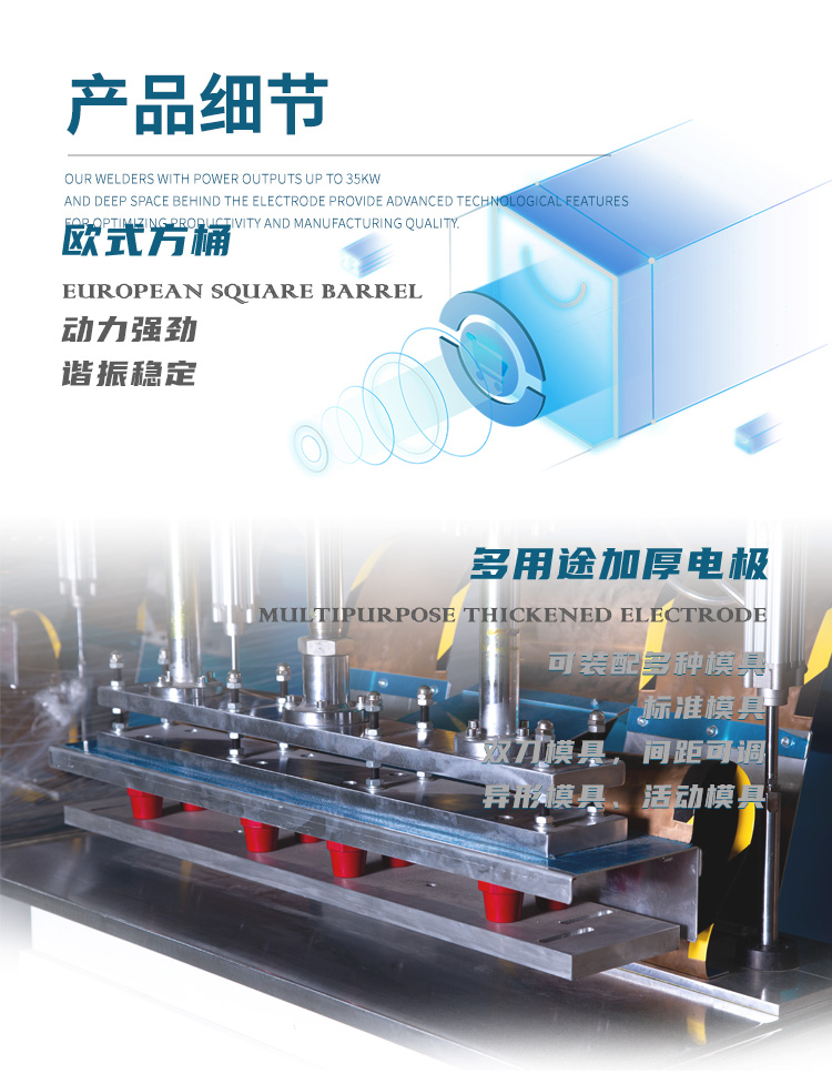 高周波膜結(jié)構(gòu)帆布熔接機(jī)的技術(shù)規(guī)格: 機(jī) 型: HR-8KWA HR-10KWA HR-12KWA HR-15KWA HR-25KWA 高 周 功 率: 8000W 10000W 12000W 15000W 25000W電 源 電 壓: 380V 50/60HZ 高 周 頻 率: 27.12MHZ 13.56 MHZ 輸 入 功 率: 15KVA 18KVA 20KVA 25KVA 35KVA 整 流 器: 矽二極體 振 蕩 管: 7T69RB E3069 E3130 8T85RB 8T25RA 最 大 壓 力: 500kg 600kg 800kg 1000kg 1500kg 電 極 間 隔: 150 mm 活 動(dòng) 行 程: 150 mm 上模夾 尺寸:50*50*800mm 50*50*800mm 50*50*900mm 60*60*900mm 50*50*1000mm 熔 接 時(shí) 間: 0---10s <機(jī)器相關(guān)所有尺寸,均可根據(jù)用戶要求定制。因改良需要,規(guī)格變動(dòng)不另通知> |