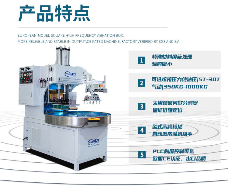 ★用于吸塑包裝封口的高周波機(jī)器功率常用的是:5000W、8000W、12KW、15KW幾種,使用時(shí)可根據(jù)吸塑包裝的產(chǎn)品尺寸大小,來(lái)決定一次同時(shí)包裝1個(gè)或多個(gè)產(chǎn)品。高周波模具一般為一個(gè)上模、三個(gè)或多個(gè)下模,轉(zhuǎn)動(dòng)交替工作,機(jī)器的產(chǎn)量大約為3500-4500次/8小時(shí)。用戶也可以根據(jù)產(chǎn)量來(lái)選擇效率更高的多工位自動(dòng)轉(zhuǎn)盤(pán)式高周波機(jī)械。可省人工且自動(dòng)化程度高,也可以選擇配置機(jī)械自動(dòng)取料。更多詳細(xì)情況歡迎致電日力公司。