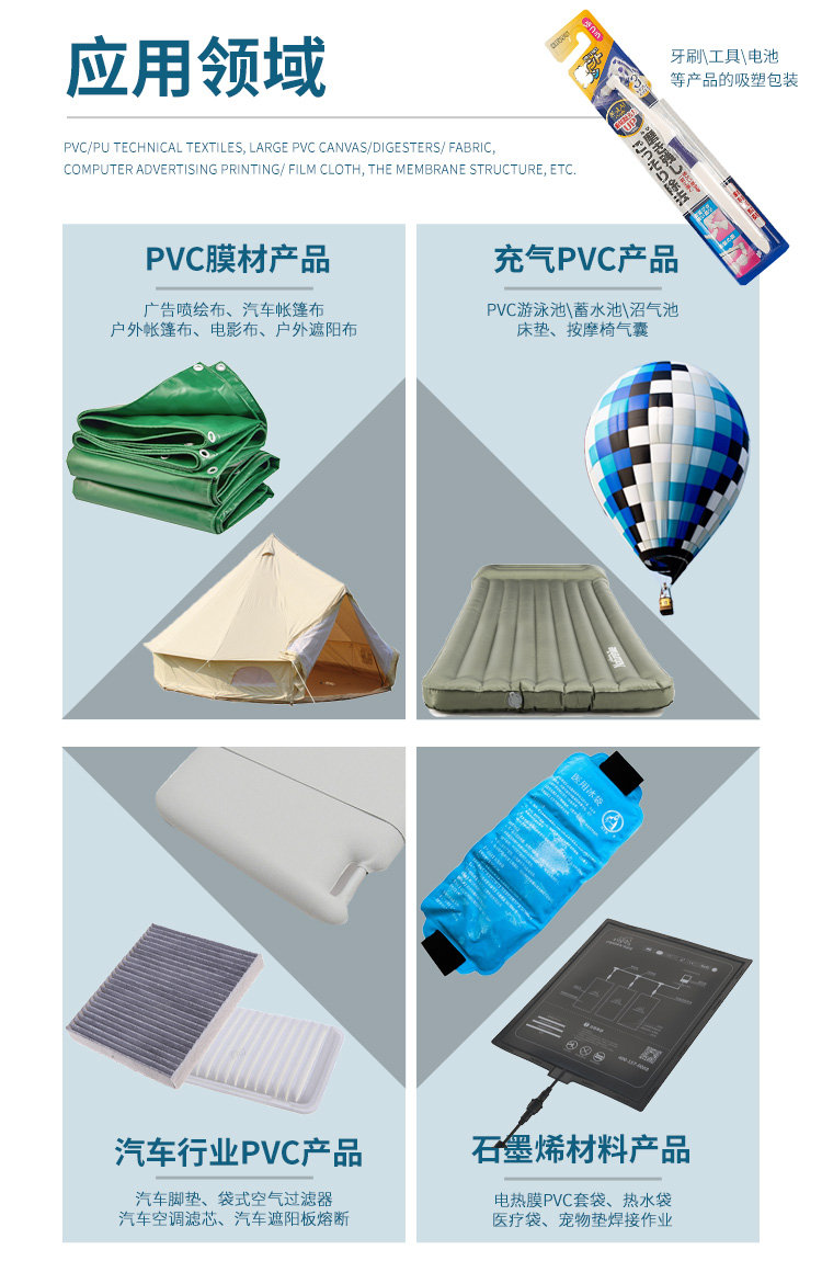 文具用品包裝、電子產(chǎn)品包裝、MP3、MP4、MP5吸塑包裝、牙刷包裝、牙線包裝、玩具包裝、禮品包裝、五金工具包裝、U盤(pán)包裝等吸塑紙卡包裝,也可用于PVC柔軟線膠盒成型,塑料熔接、PVC加工等用途。