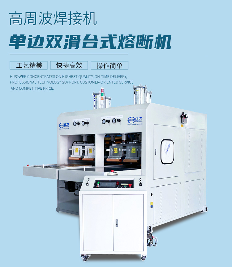 ★高周波熔斷機通常分為;自動轉(zhuǎn)盤式高周波熔斷機(可選配機械手自動取料)、自動滑臺式高周波熔斷機、手動推盤式熔斷機、雙頭式高周波熔斷機、定盤式高周波同步熔斷機等幾種。也稱為高周波熔斷機、熔斷機、高周波同步裁斷機、高周波裁斷機,本公司均有專業(yè)生產(chǎn)。本機采用低損耗的歐洲制式同軸高頻諧振器,高周波輸出電力強大,能以迅速時間使制品熔接,大大提高生產(chǎn)量。