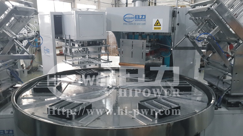 第3個工位由機械手自動放入紙卡到模具, 第4個工位上泡殼吸塑吸塑機械手放入轉(zhuǎn)盤模具內(nèi)