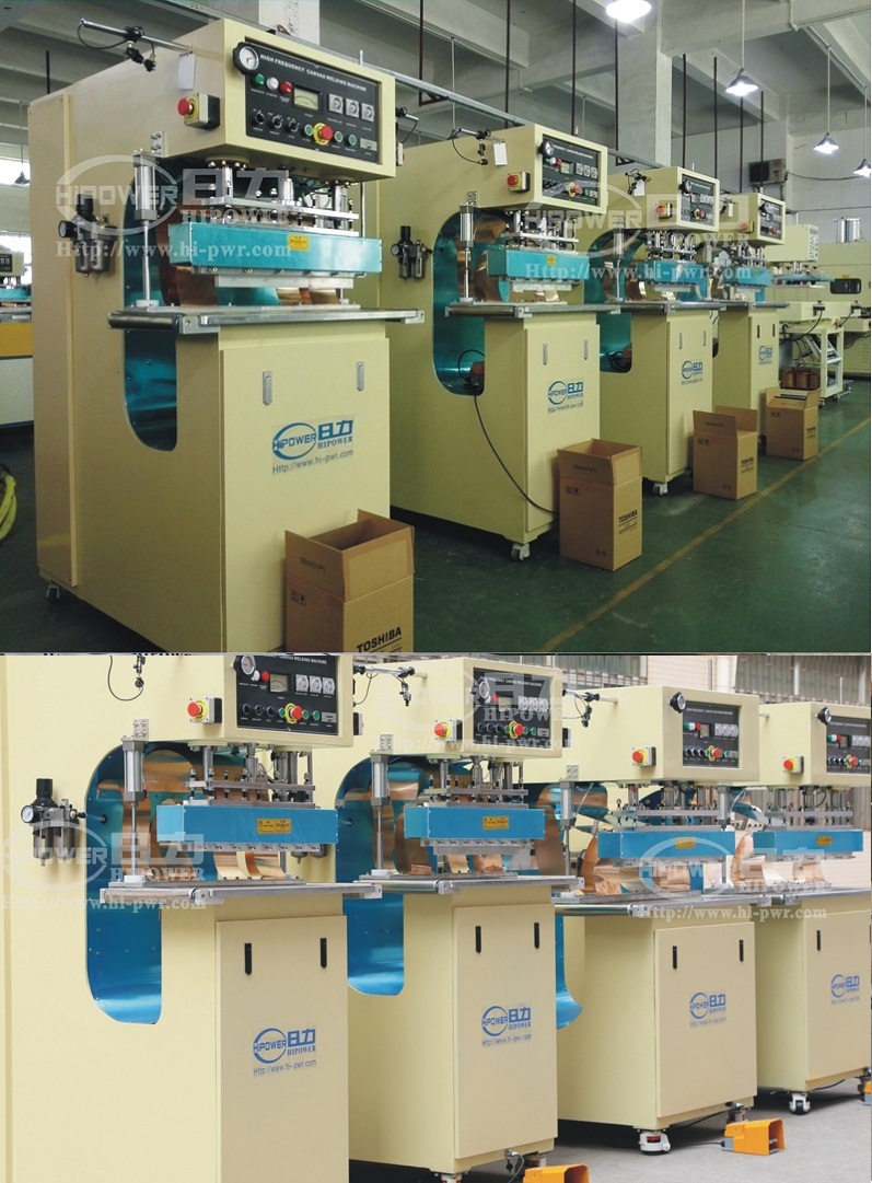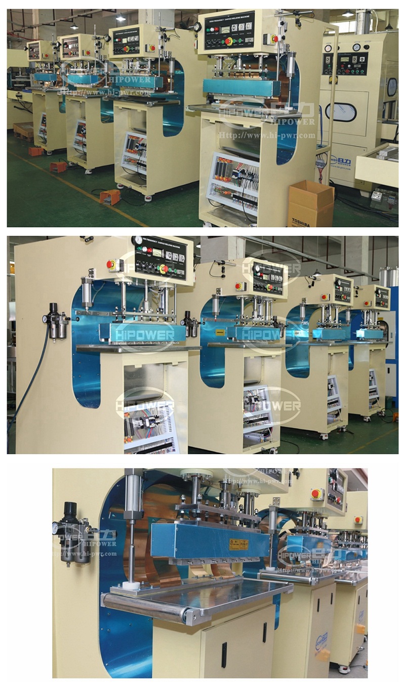 該機(jī)器主要采用高壓變壓器整流自激高頻電子管振蕩瞬間產(chǎn)生高頻電磁波電場(chǎng),利用被加工的PVC、TPU、等塑膠、塑料原材料在高頻電磁波電場(chǎng)內(nèi)其被焊接塑膠、塑料材料的內(nèi)部分子產(chǎn)生極性化生熱,加上一定的壓力使所需要熱合焊接的塑料、塑膠產(chǎn)品達(dá)到熔接封口作用,機(jī)器結(jié)構(gòu)和模具等可根據(jù)客戶要求做調(diào)整